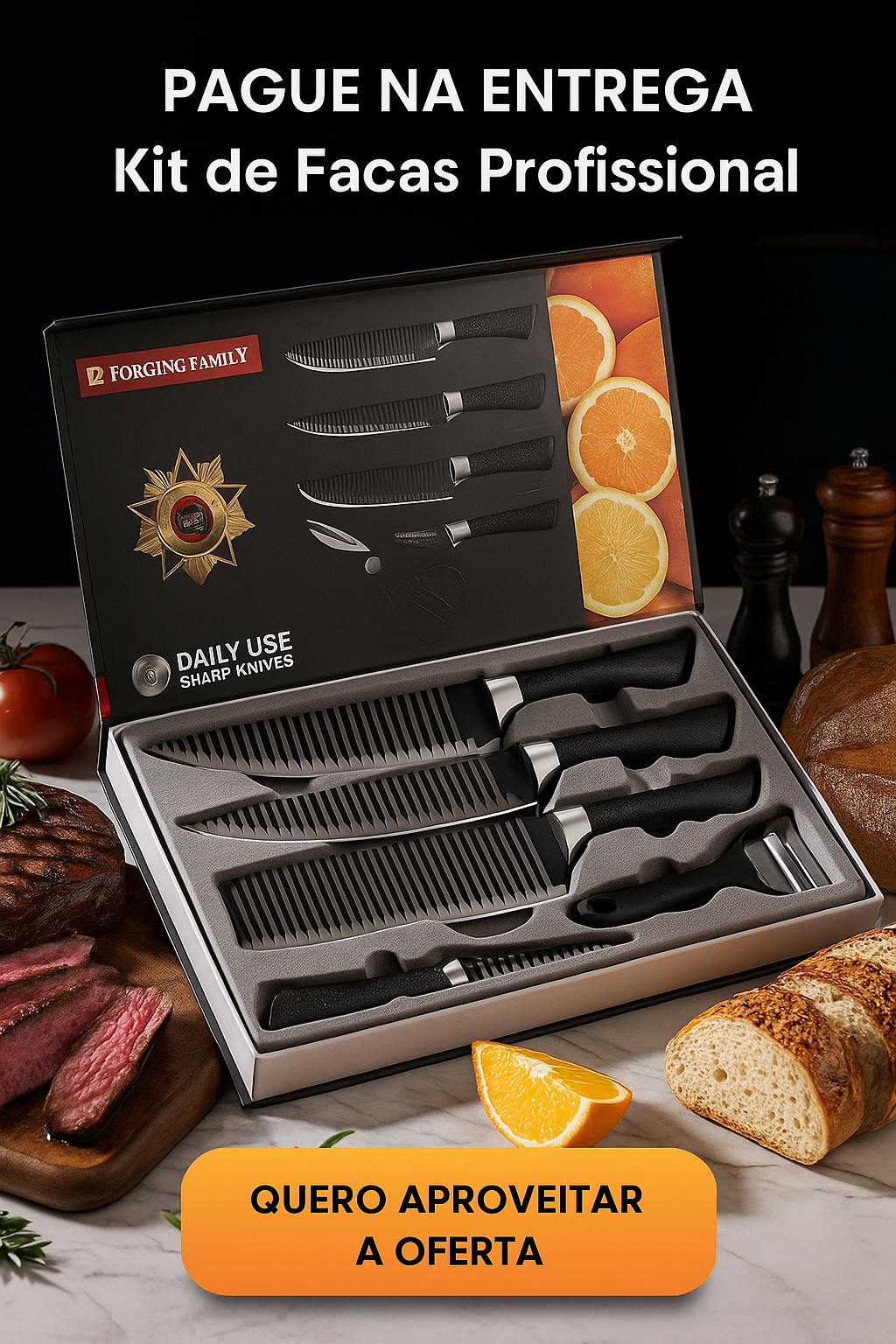 Este Kit de Facas Profissional conta com seis peças revestidas com material antiaderente, lâminas super afiadas e acabamento sofisticado na cor preta.